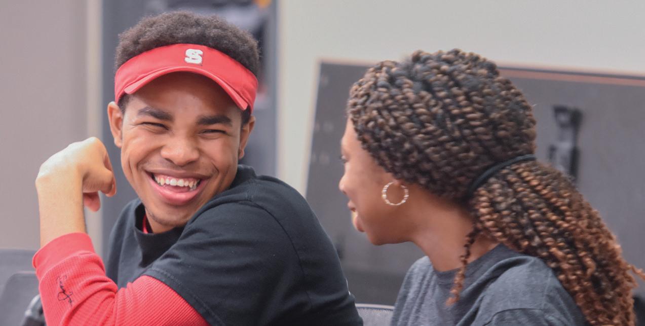 Sahmad Moore (left), a second-year studying computer engineering, laughes with I'Yari Wade (right), a first-year in exploratory studies, at the Black History Month Chat & Chew in the African American Cultural Center on Wednesday, Feb. 15, 2023. The Black History Month Chat & Chew presented multiple poems for the attendees to discuss.