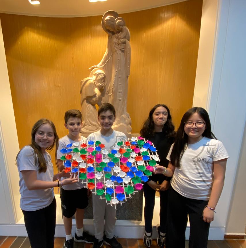 Com a chegada da Semana Rosariana – período em são celebrados o Dia de Nossa Senhora do Rosário e o aniversário do Colégio – os alunos encontraram uma maneira criativa de expressar sua gratidão. Eles confeccionaram um grande coração de jornal e o decoraram com flores coloridas de origami. Cada flor foi preenchida com palavras que simbolizam o que eles sentem pelo Rosário e expressam seu agradecimento. Palavras como “respeito”, “justiça”, “amigos”, “funcionários”, “conhecimento” e “acolhimento” apareceram em destaque, refletindo o carinho e a dedicação que experimentam diariamente no ambiente escolar.