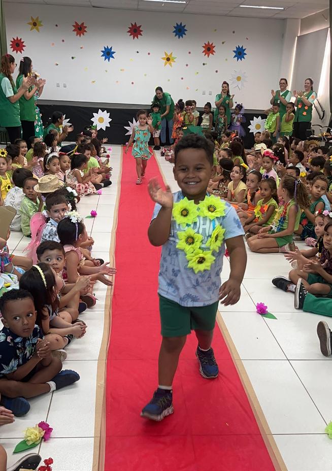 Como culminância desse período, a equipe organizou o Desfile da Primavera, no qual as famílias se uniram em uma celebração pela chegada da nova estação. Os trajes das crianças, criativos e sustentáveis, combinaram peças do vestuário infantil com materiais reciclados, refletindo o compromisso da escola com práticas ambientais.