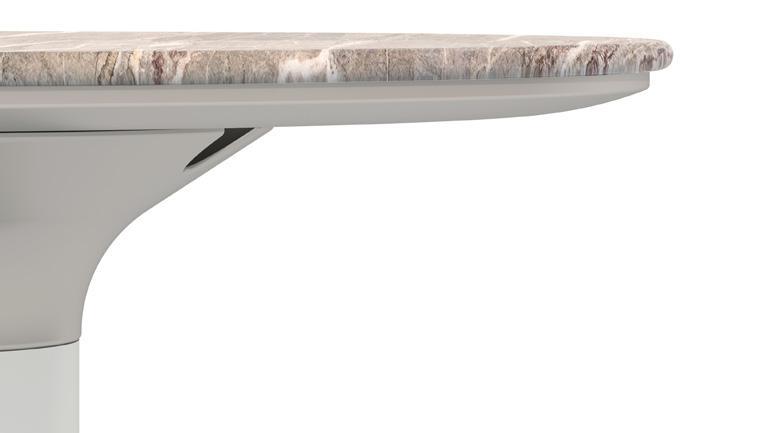 Offering a broad range of material choices, the Perspective Collections allows for personalization that suits different environments and aesthetics. Top materials including veneer, glass, stone, and laminate can be paired with paint or veneer bases for true design flexibility. The organic curves of the bull-nose edge detail and the table base create harmony in traditionally tech-heavy spaces.