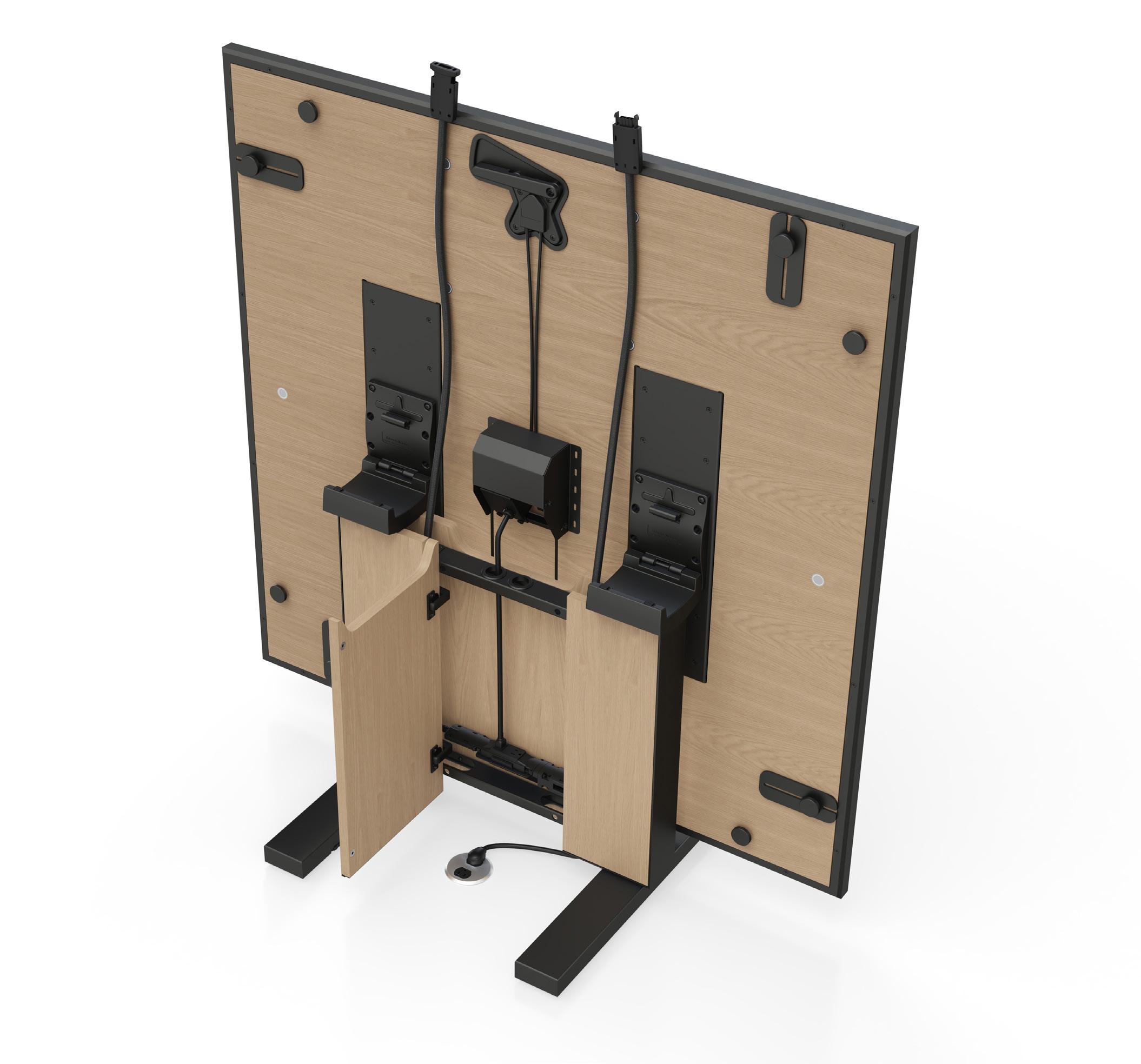 Approach features a variety of integrated power and AV options, offering both in-surface and under-mount connections. The Power Matrix system combines concealed functionality with a refined design, offering door options in veneer, glass, or metal. Tables with veneer and glass surfaces are designed without a bezel, featuring matching material doors for a seamless look. USB-A+C charging option ensures compatibility with modern devices, enhancing the system’s technological versatility.