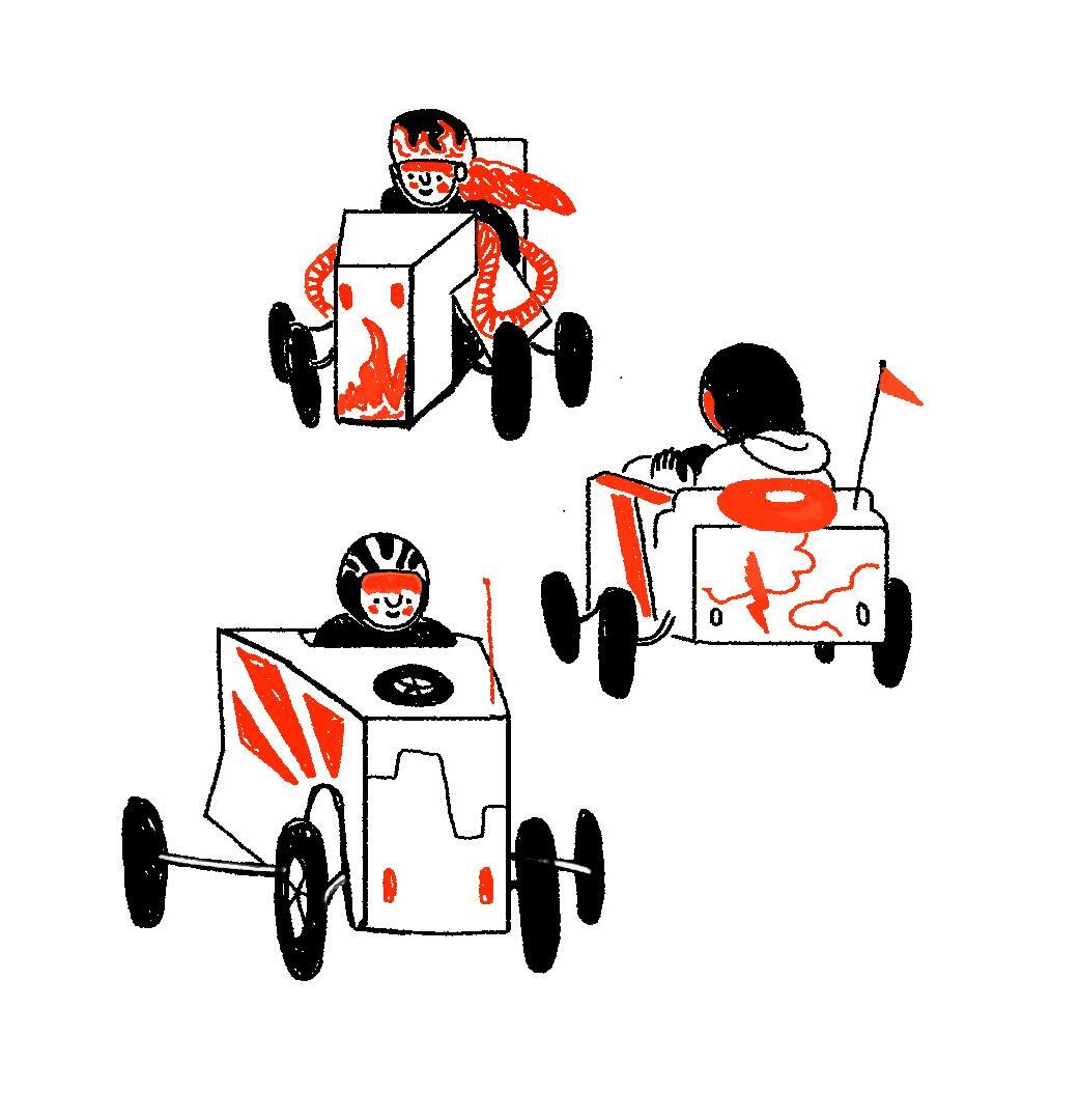 Kassabilakappkoyring: Jákup Veyhe og Jensina Olsen standa við málstrikuna og siga frá. Kappast verður í ymsum bólkum frá brúnni um Gjógvará og oman til torgið, og sum nakað nýtt er eisini ein skumpikapping frá Bedingini og heim á torgið