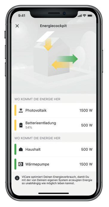 På ViCare-appens energicockpit har brugeren overblik over alle husholdningens energistrømme.