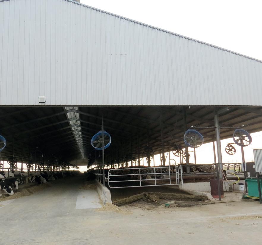 El imponente galpón tiene capacidad para 680/700 vacas, en su posición este a oeste tiene 170 metros de largo y 40 metros de ancho, con una altura baja de los costados de 4,5 mt. y punto máximo de 11 mt. Los efluentes se evacúan mecánicamente con un scraping y son arrastrados hacia una cañería por donde circula un torrente de agua a una pista de hormigón de 120 metros pasando luego a un inodoro y desde allí se traslada por cañerías a piletas de decantación.