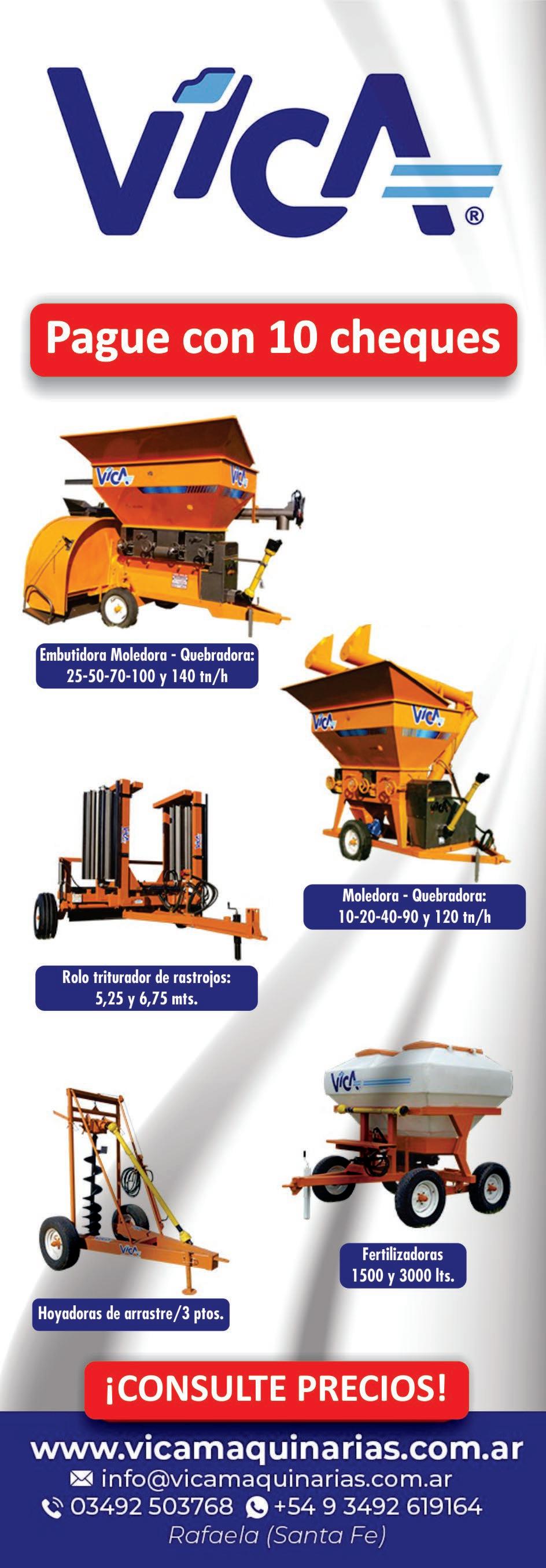 *Rotoenfardadoras Mainero 5880- *Sembradora Cele 25/17.5-*Carros Forrajero Mainero B-400- *Maicero- *Ombu 13/52 y 8/70- *Maicero Mainero 1889 12/52.5- *Rastrillo Balina 15 Estrellas en V Bv. 25 de Mayo 78 Porteña (Cba.) Tel. (03564) 451314 E-mail: ventas.fessia@gmail.com www.vitopfessia.com