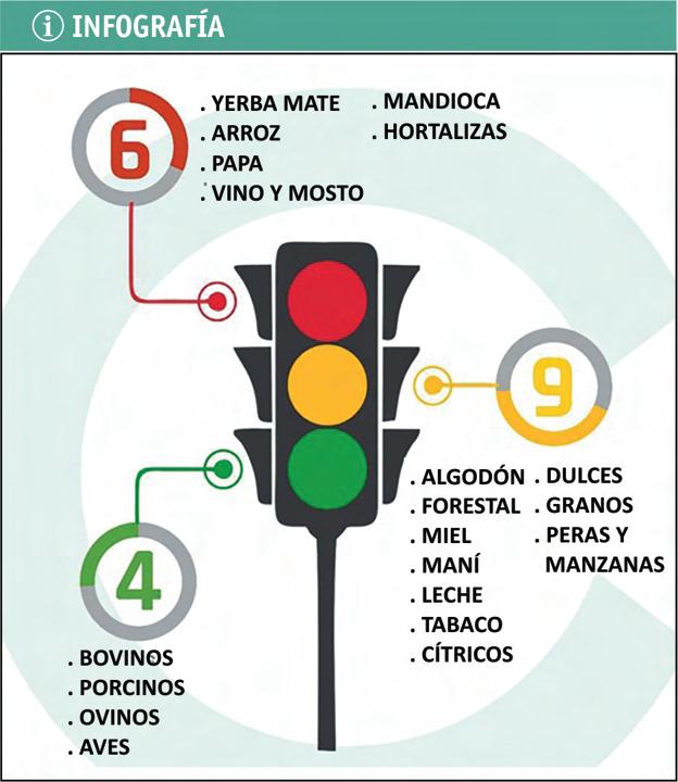 En amarillo se encuentran las ocho actividades restantes: forestal, miel, maní, leche, tabaco, cítricos dulces, mandioca y peras y manzanas. Estas economías no evidencian ni mejoras ni deterioros significativos en los tres componentes evaluados.
