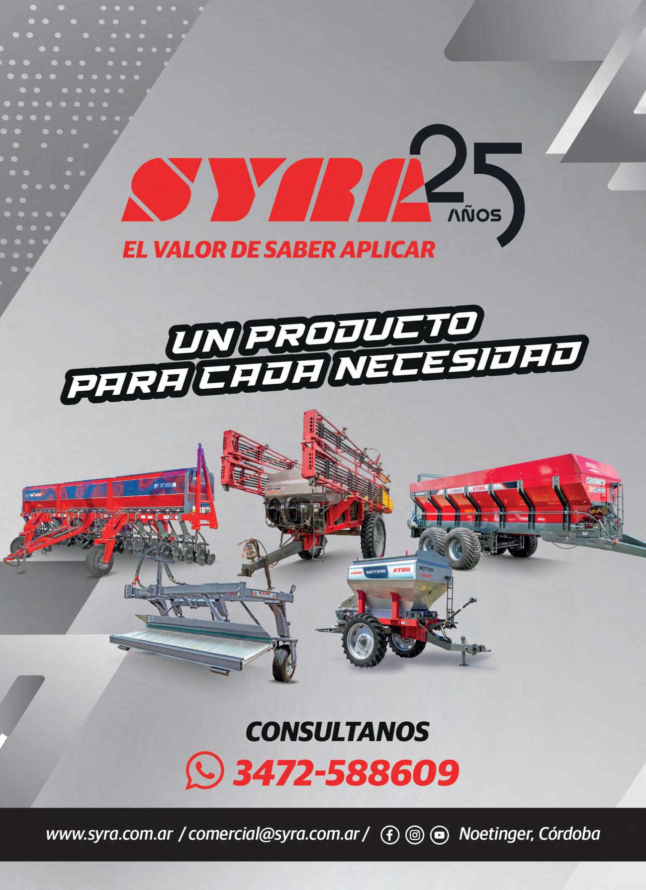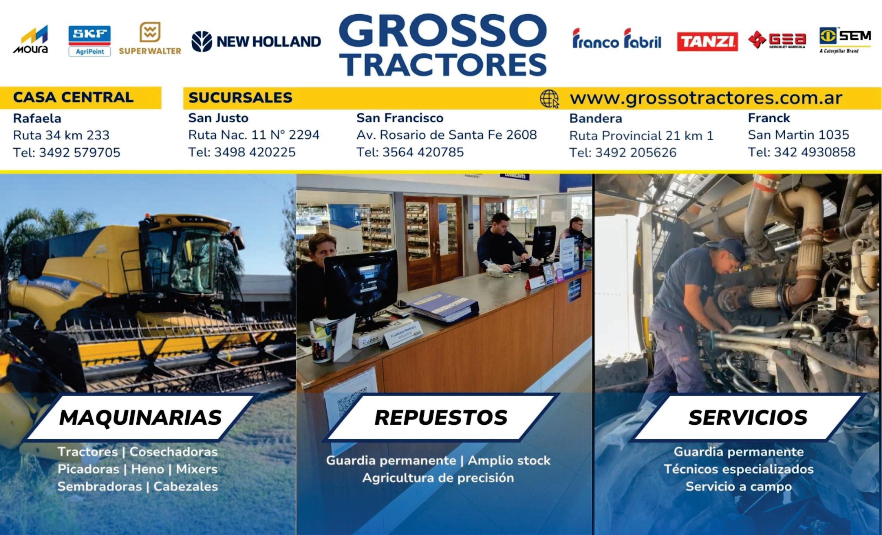 Extractora de forraje FRAGA modelo FURCA; Sembradora Grano Grueso Pierobon Mix 9800 de 9 a 52; Sembradora Grano Grueso Agrometal TX MEGA de 13 a 52 y TX 7/70; Sembradora Grano Fino Gimetal de 25 a 17,5; Sembradoras Grano Fino TEMPLAR,TANZI, APACHE; Sembradora Grano Fino GIORGI D 10 de 28 lineas con alfalfero y fertilización; Rastra OMBU de 56 platos nueva, rastra CELE de 40 platos reparada y pintada, rastra KERN de 36 platos, rastra OMBU de 28 discos; Desmalezadora nueva BAIMA y usada; Picadora picado grueso, integral y no integral, marca MAINERO y RICHIGER; Mixer horizontal de 9 mts., marca GEA, AGROAR,CERUTTI,TECNOCAR; Mixer vertical 14 mts3 , marca MONTECOR usado, y JUAREZ nuevo y usado;