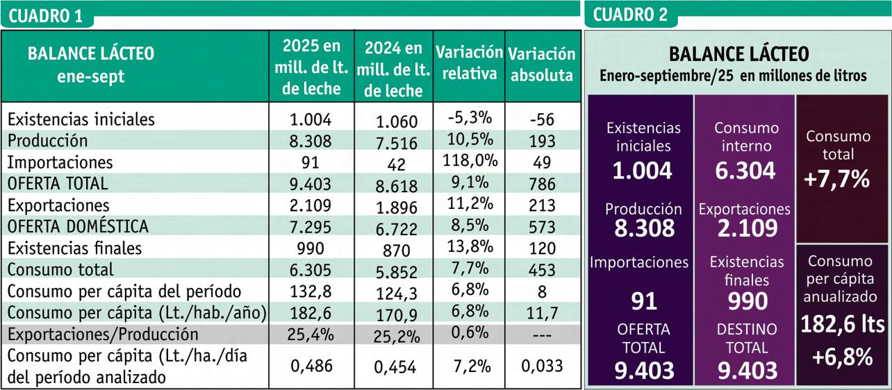 En el mes de septiembre, la producción fue de 1.115 millones de litros de leche, esto implica un valor 2,3% por encima del mes anterior, un 9,9% más que igual mes del año anterior y el acumulado de los nueve meses transcurridos del año subió un 10,5% respecto al 2024, incluso se podría indicar casi un 11%, al considerar el promedio diario de producción.
