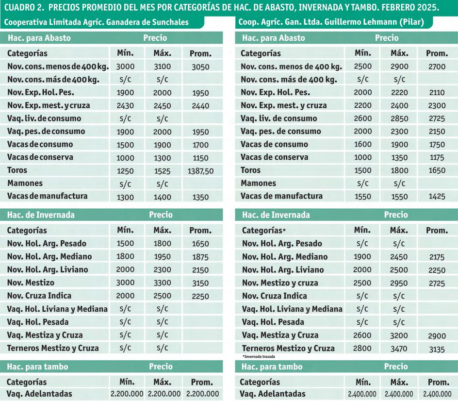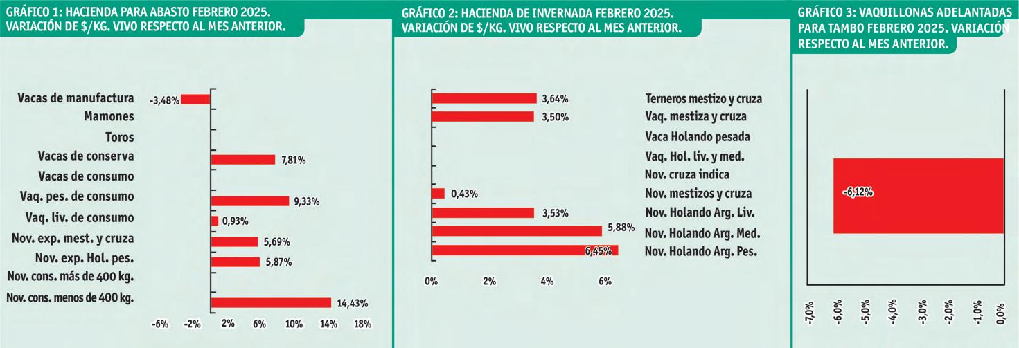 El promedio de precio en febrero 25 para este tipo de hacienda fue 2.442,50 $/kg. vivo, y significó una suba de 3,07% con respecto a enero próximo pasado. Todas fueron subas, y la más importante fue para el novillo holando pesado con 6,45%, luego siguió el novillo holando argentino mediano con 5,88%, los terneros mestizo y cruza con 3,64%, las vaquillonas mestiza y cruza con 3,57%, los novillos holando argentino livianos con 3,53%, y los novillos mestizo y cruza con 0.43%. No cotizaron la vaquillona holando pesada y la vaquillona holando liviana y mediana. No registraron variación en su precio los novillos cruza índica ( Gráfico 2 y Cuadro 2 ).