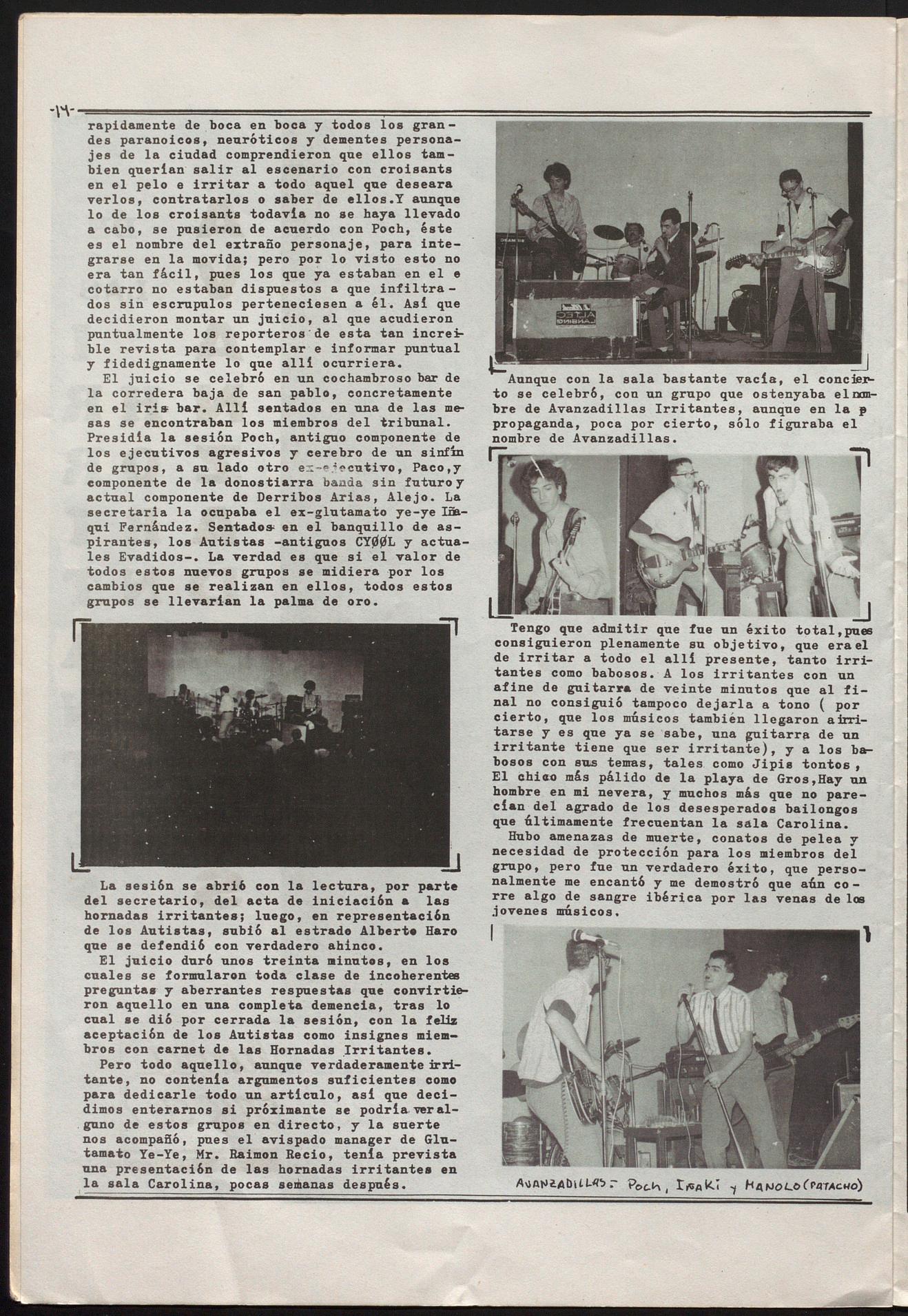 A mí jamás se me habría ocurrido dedicarme a un placer tan masoquista como opinar sobre lo más florido de la nueva ola locaL.. No quiero recordar durante mucho tiempo a PARAISO, ni a algunos de sus miembros, ni a algunos de sus fans. Me quedo con KAKA DE LUXE Uno de los supremos emplaza en su despacho a ALASKA Y LOS PEÇlAMOIDES, coge el acetato recién impreso y lo tira al suelo diciendo que se lo pueden meter por el culo La extrema juventud de BERNARDO (ZOMBIES) contrastaba ferozmente con sus obsesivos intentos de conjurar en su frágil personita las furias endemoniadas de LOU, la IGUANA DE DETROIT a MR. VERLAINE NACHA POP son un grupo de triunfadores con un panorama dorado hasta que sus fans les pidan algo de lo que carecen en absoluto: imaginación... LOS EJECUTIVOS AGRESIVOS actúan en EL GRAN MUSICAL, con el TORONJO resfriado y el sonido desastroso, y la etiqueta de subproducto les queda marcada a sangre y fuego El porvenir de RUBI y LOS CASINOS sigue regido por lo que aguante el público a una KARINA-VARTAN con pinta de LEIF GARRETT redlseñado por CEESEPE... Son las familias de los dos argentinos de TEQUILA quienes se ponen al habla con la compañía. Si ésta suelta millón y medio, àlias sueltan lo mismo y se puede financiar un verdadero lanzamiento GRETA en la Filmo y vale Al que no le gusten TRASTOS es un anormal. El futuro parece rosado para EL AVIADOR ORO Hoy lo insólito es patrimoniò de la juventud española: las nuevas generaciones no tienen nada de tercermundistas, aunque TEJERO y la extrema izquierda se empellen en no entenderlo. El fantasma de MARC BOLAN ha vencido en toda regla a la cretinez obligada apta para menores de 1 5 alios. Un saludo.