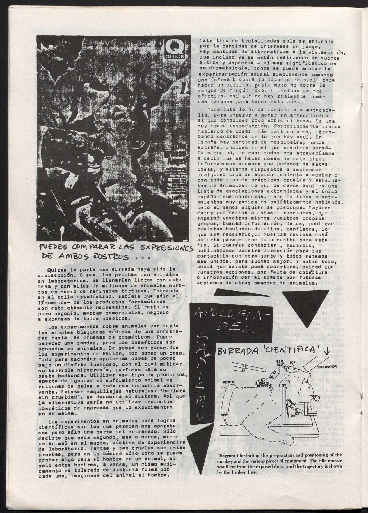'�ue largc¡' retras,o. 'Paro aqu! da nuevo. Un tiempo transcurrido donde ha pasado de todo, y donde ultimamante una racha da mala suerte no ha atacado salvajemente, hasta al punto de dudar qua asta n�maro volviese a salir. Pero ha�ós salido y todo gracias a la gente qua nos ha ayudado y alentado en momentos bajos. Ahora estamo� listos para seguir da nua-' va, a pesar da la gente qua quiere ponernos zancadillas. Tenemos una larga lista da artículos�� que na han podida entrar aquí como entrevistas y reportajes da I NSANI n'DEFENSE, FINLANDIA, �RP�, INSTIGATORS, STOP THE CITY (publicamos un extracto), YUGOSLAVIA, AUSTRALIA; SCAPEGOATS, SUllA (uno más detallado y extenso), BELGICA, S.U8VERSION y cosas qua vengan en camino. No hemos publicado sección de cartas, debido al espacio y a que no habra ninguna expresamente para ser publicada, excepto la de un anónimo mad ri Le ño KADA, qua nos preguntaba una seria da casas y qua espero qua alguna da laa secciones nuevas (contac taS' y ast) la da respuesta a alIas, sino, escriba otra vez y danos tu dirección y charlamos"vale. Pero queremos seguir publicando cualquier suge ranci a, crítica, a Lo qua sea, con tal da qua sea imaginativo y aporte algo. Esperamos qua la sección da discos para comprar oa; parezca accesible. Esta hecha sin afán da lucro solo para ofrecer una alternativa a laa tiendas y a todos las mercadere� del punk. Aquel qua no tenga tocata, puede mandarnos, cintas- (que no sean mierdas parque-· sino se nos jode el aparato) y por los gastos da transporta,� os grabaremos la qua querais. Ln la da los discos han ocurrido algunas desgracias como el palo qua nos dieron en aduanas con 12 discos da Upright Citizens, la qua motivo qua nos clavasen 2.00 pelas más por di!, ca, y saliesen a 1.050,-, salvo estos percances, qua aprendida la le�ci6n no creo que vuelvan a suceder, al precio de los discos permanecerá tan barato como podamos. Gracias a la gente que, a pesar de esa precio nos com pro los discos. Otra cosa SDn las 4 páginaamanos de la revista, debido a que antea; laa pérdidaa que nos dab. la revista las pagabamas con nuestro curro, pero ahora se acabo el curro y asas � ·>,)"1"',,,, pér.idas no podemoa ClJbrirla•• Espero que sepais comprender.