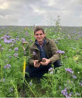 After a failed OSR crop, Toby Simpson NSch replanted this heavy clay field in Cambridgeshire with a mix of phacelia, oil radish, vetch, spring beans and Egyptian clover, as well as a border of sunflowers. The longer-thanusual growing period for the cover crop allowed it to become well-established and flourish, much to the delight of passers-by on the adjacent public footpath. It was then rolled to terminate growth and to cycle nutrients back into the soil ahead of a winter wheat crop, minimising the need for sprays and inorganic fertilisers.