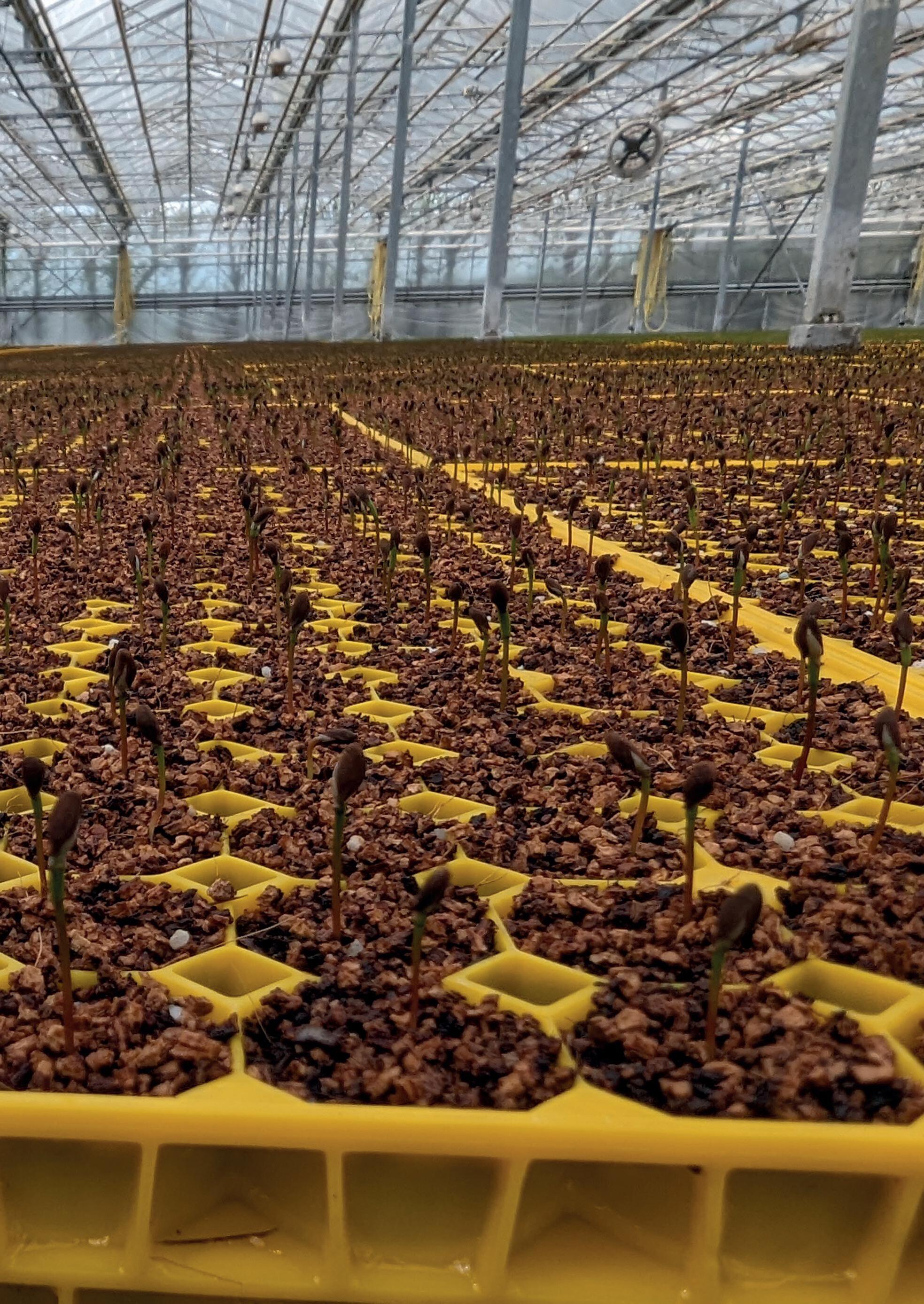 Premier Plant Products (PPP) in Hull, UK is a wholesale young plant propagator specialising in salads, brassicas, and tree saplings. Traditionally these plants are produced in pressed peat blocks to enable handling during planting, or transplanting into larger containers. Use of the Ellepot system is transforming this production process for PPP, allowing air pruning to prevent the plant becoming root bound and the reduction of peat in the production process, to a more sustainable growing medium whilst maintaining easy handling of young plants. The use of the Ellepot system also facilitates a move towards significantly more automation in the production process to fill the Ellepot, plant the seed and fill the tray. This automation is crucial at a time when labour is difficult to obtain in the agricultural sector. The Ellepot is used for growing Sitka spruce seedlings indoors in this example, but this method will be used more widely next year in the production of 25 million vegetable plants.