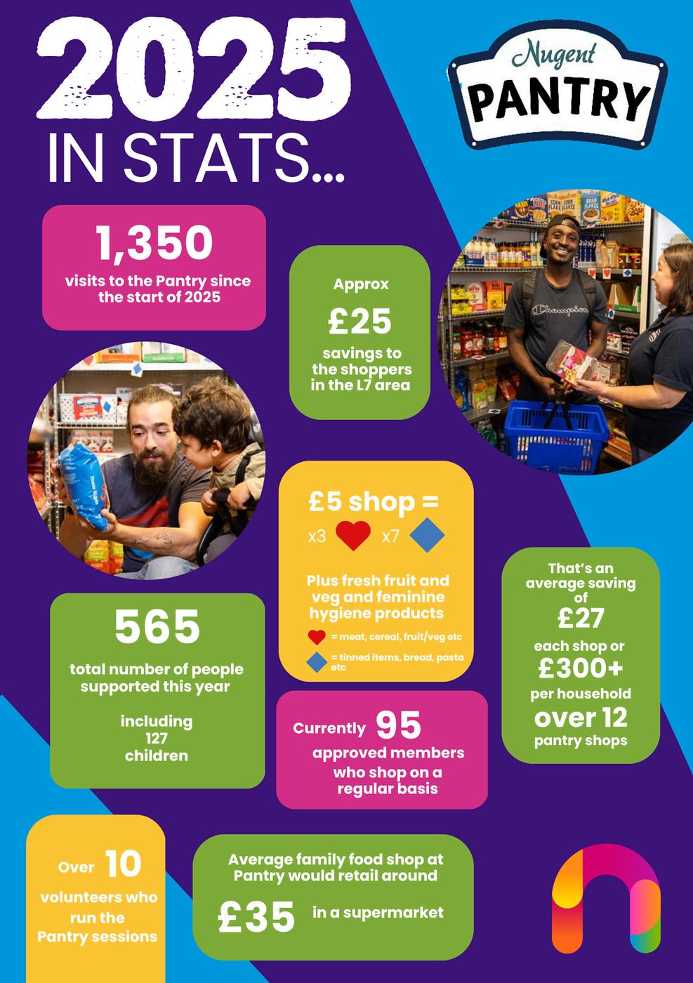 NugentPantryhasbeenrunningforfouryears.ItisbasedinStAnne's Church,EdgeHillandinadditiontofoodprovisionwealsoprovidearelaxed andinformalmeetingplaceforeveryonewhoattends;aplacetofeelsafe andwelcomed.