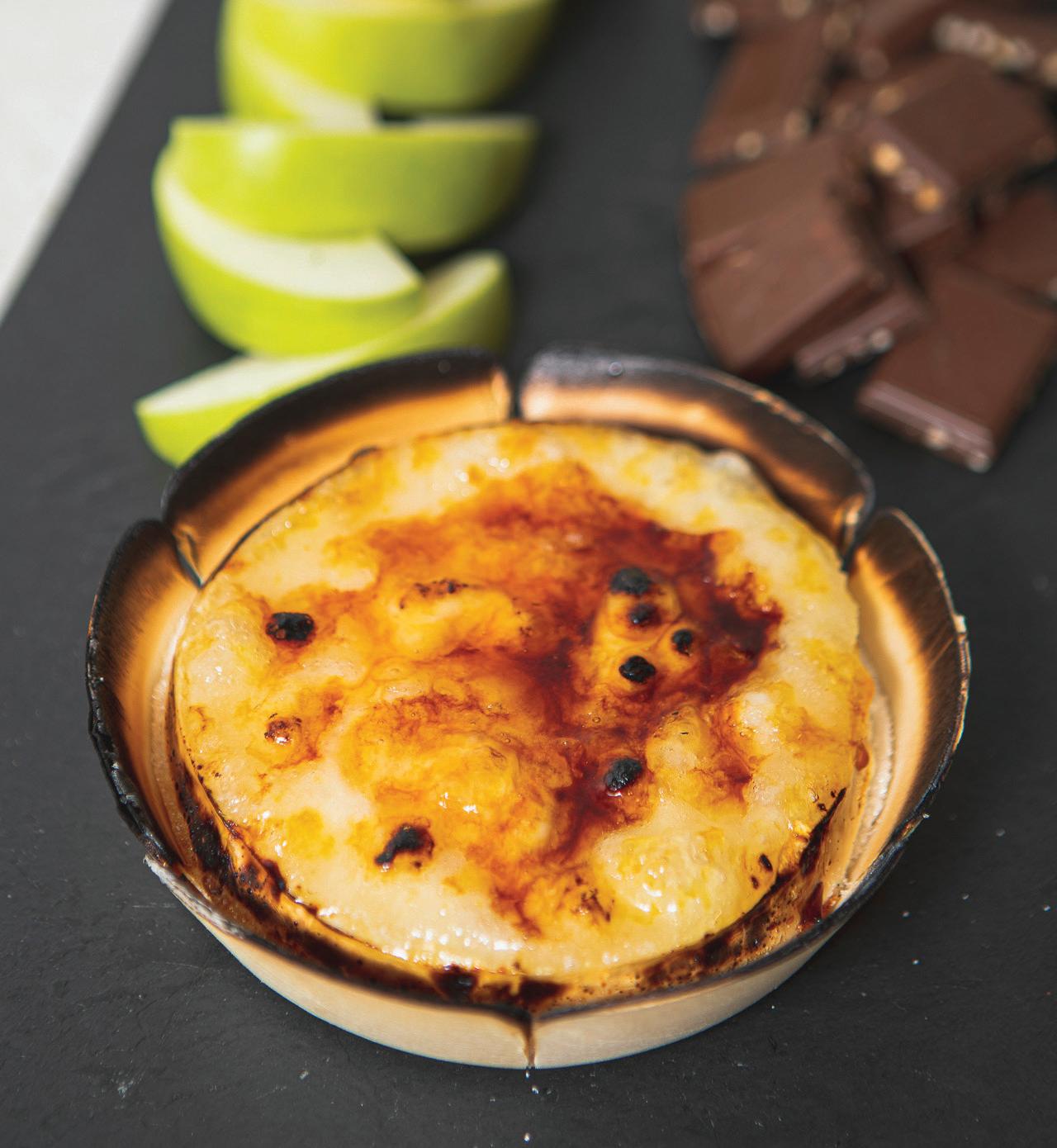 While brûléed cheese is good enough to eat with just a spoon (no bread or crackers needed), it's nice to clear the palate with fresh berries, apples, grapes and pears. To make things even more decadent, try using milk chocolate and candied nuts as a side, and wash it all down with a cognac or vanilla or caramelforward bourbon.