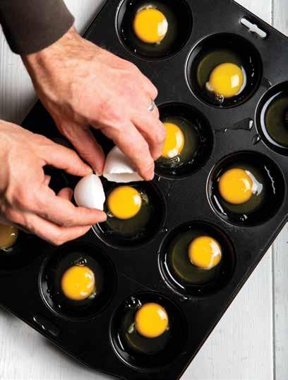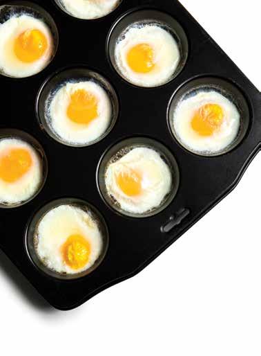 Heat oven to 300°F. Place 1 tablespoon of water in each well of a nonstick muffin tin. Crack an egg into each well and bake for 8-12 minutes, or until the whites are set and the yolks are still runny.