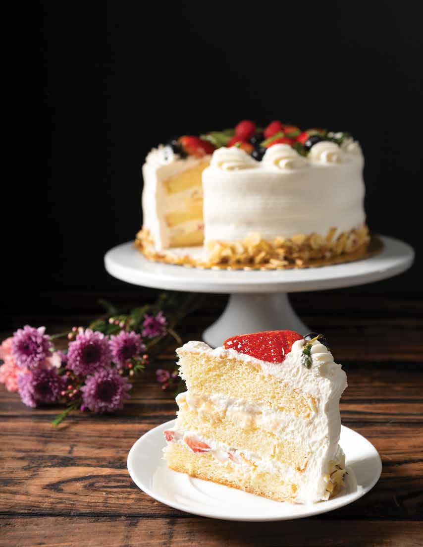 Fruit is always in fashion, especially in this vanilla sponge cake layered with banana custard, pineapple, strawberries and real whipped cream, then topped with fresh seasonal fruit and finished with toasted almonds.