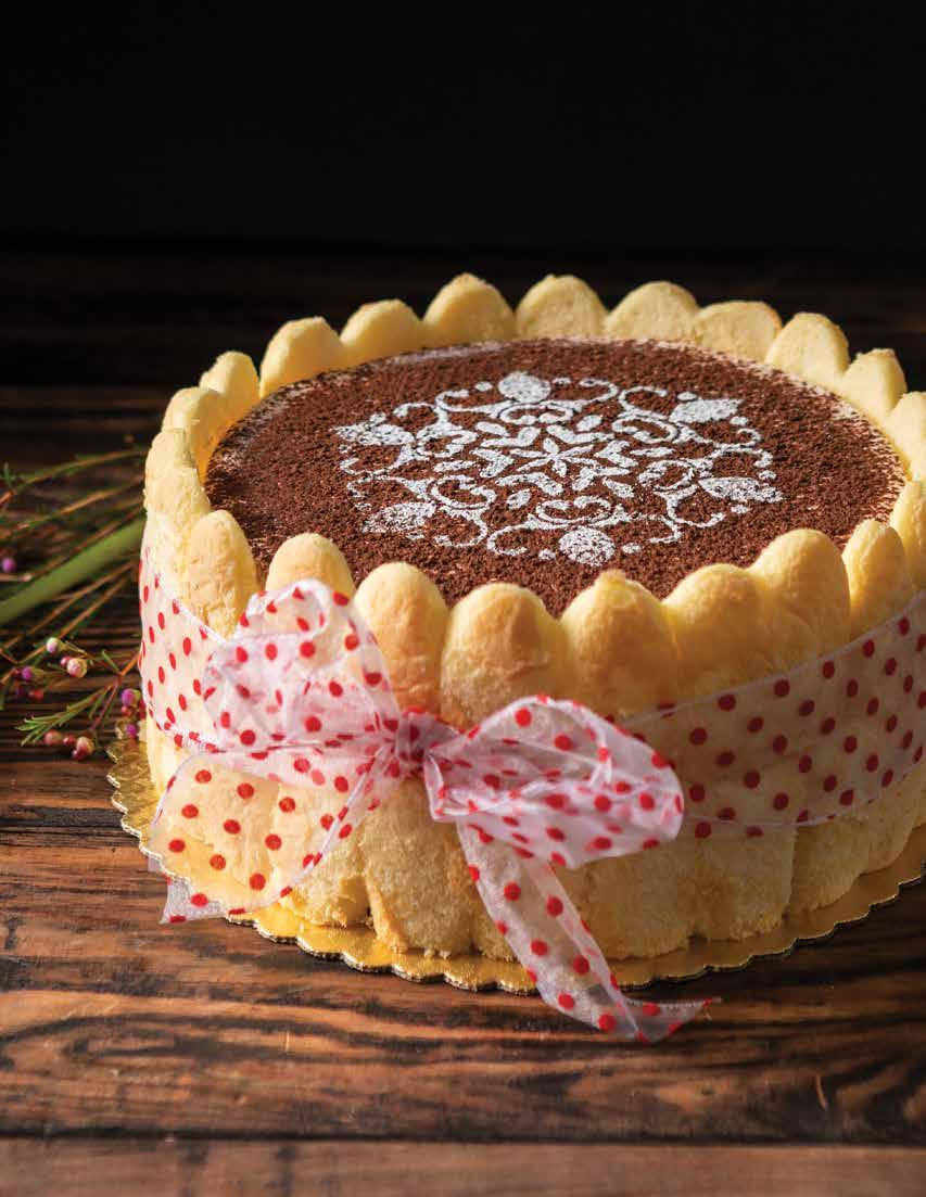 Lady fingers surround this stunning vanilla sponge cake soaked in espresso and rum, layered with mascarpone whipped cream, dusted with cocoa and icing sugar, and tied with a ribbon.