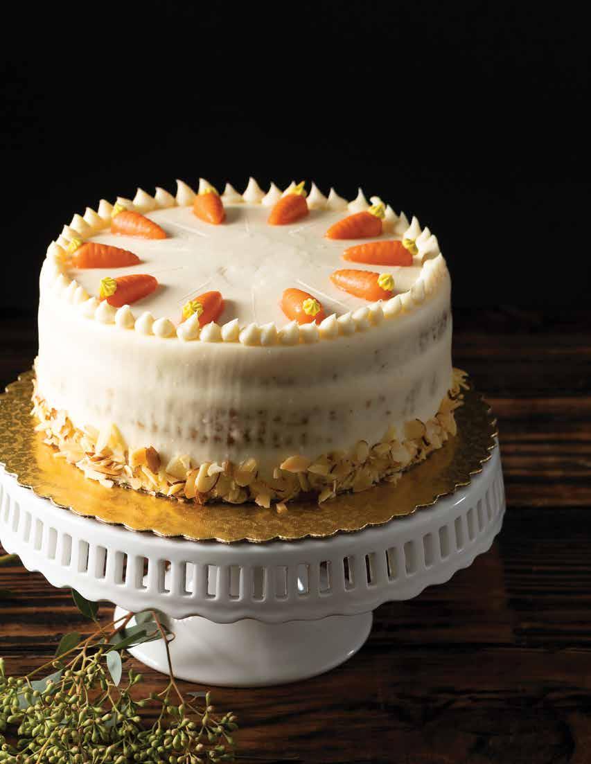 Both timeless and tasteful, sweet and spiced, our classy, homemade carrot cake is filled and frosted with scratch-made cream cheese icing and decorated with toasted almonds and miniature marzipan carrots.