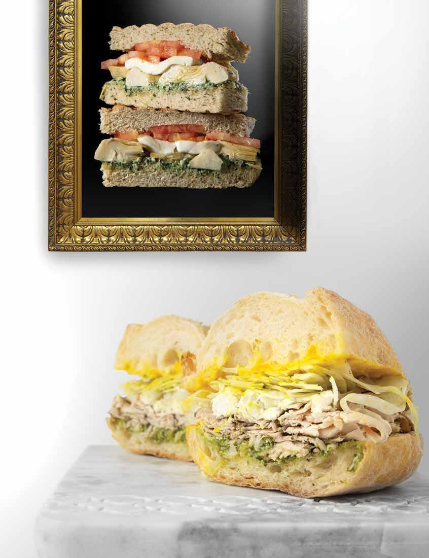 Turkey, fennel, chèvre, basil pesto and preserved lemon on a soft white roll.