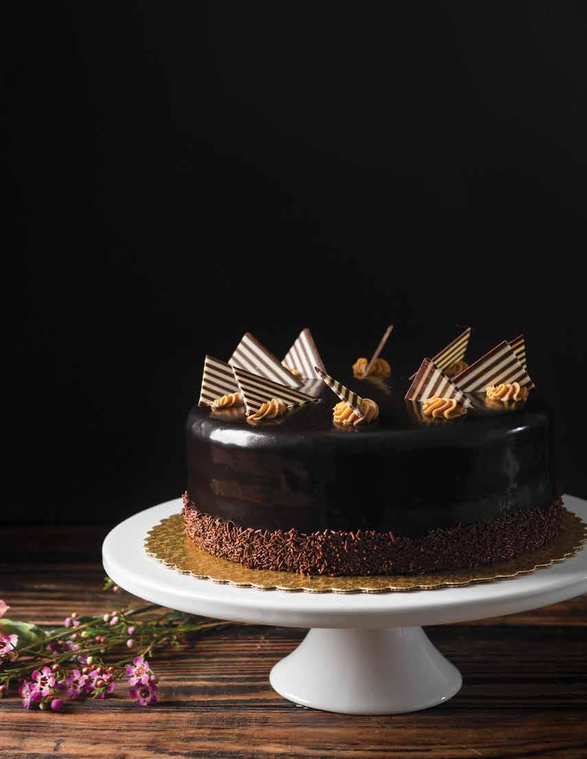Tall, dark and decadent, this dreamy cake struts its stuff with luscious layers of chocolate and vanilla sponge, rich Kahlua mousse and apricot preserves, all draped in a dark chocolate glaze.