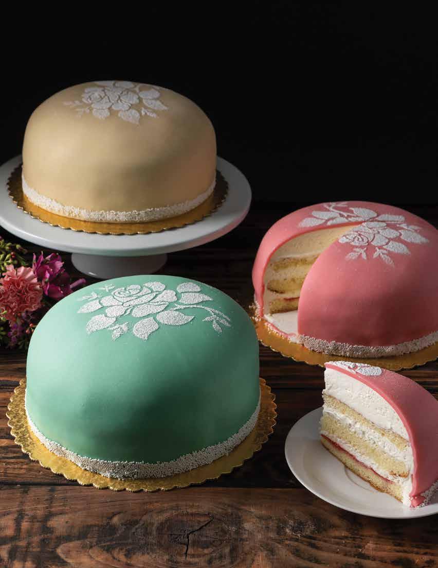 Slice into this majestic confection to find delicate layers of white sponge cake, raspberry preserves and whipped cream, all topped with a thin layer of marzipan and a stenciled dusting of icing sugar.