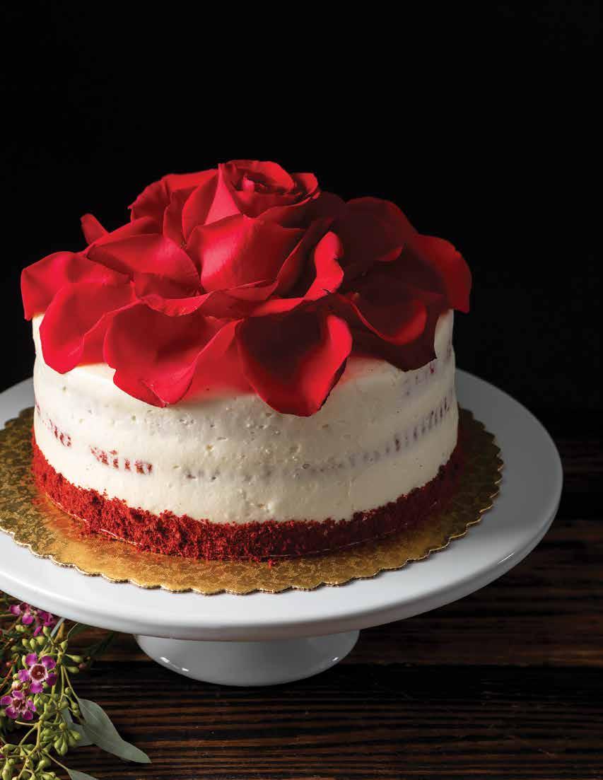 Romantic in all the right ways, our radiant red velvet cake is iced with whipped cream cheese buttercream and topped with real rose petals for an elegant finish.