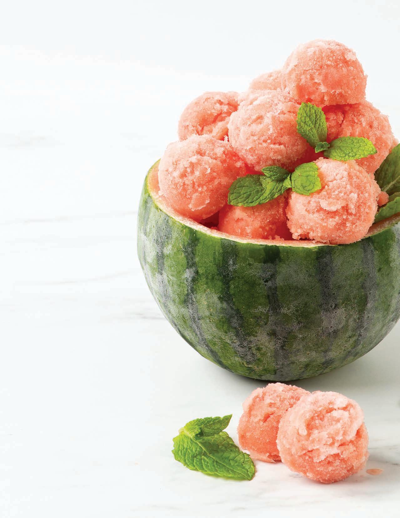 Combine sugar, water, lemon zest and mint leaves in a sauce pot. Bring to a simmer, turn off the heat and let steep for 10 minutes. Strain out zest and mint leaves, then mix syrup with watermelon puree and chill for 1 hour. Pour chilled sorbet base into an ice cream machine and churn according to manufacturer’s instructions. When sorbet is finished, place in freezer for 2 hours to set completely before serving.