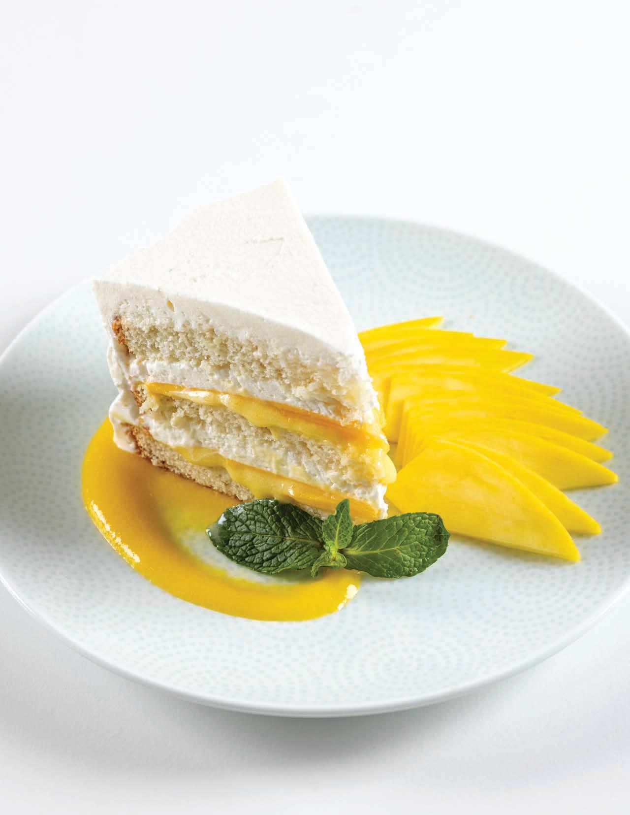 To assemble your cake, brush the bottom sponge with mango simple syrup. Top with a ½-inch-thick layer of mango curd, spread to about ½ inch from the edge. Next, shingle the mango slices over the mango curd and top with a ½-inch layer of whipped cream, spread to ½ inch from the edge. Add the next layer of sponge and repeat the process. Add the top layer of sponge, and then frost the whole cake with whipped cream. Garnish with mango slices and any leftover mango curd.