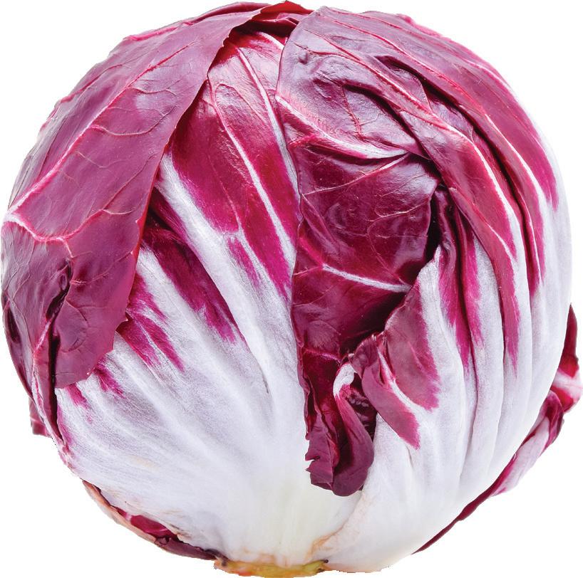 Part of the chicory family, radicchio has reddish purple leaves and white ribs with a firm, crisp texture and sharp, bitter flavor that mellows when cooked—delicious grilled or roasted!
