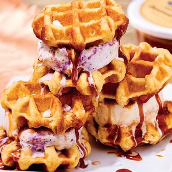 2. Set out one waffle and scoop about ¼ cup of ice cream on top. Gently spread the ice cream to the waffle’s edges with the back of the scoop or a butter knife.