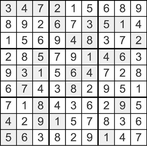 Place a number in the empty boxes in such a way that each row across, each column down, and each small nine-box square contains all of the numbers from one to nine.