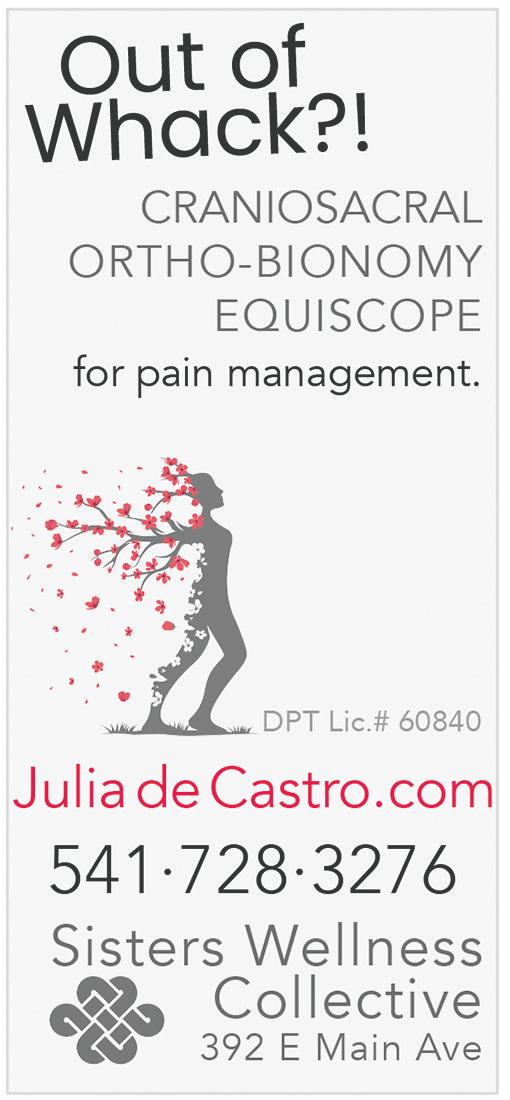 Council on Aging of Cent ral O rego n Senior Lunch In- person community dining, Tues. 11 a.m. to 1 p.m. Grab -and -go lunch Tues., Wed., Thurs 12:3 0 to 1 p.m. Sisters C ommunity Church. 5 41-4 8 0-18 43 East of the Cascades Quilt Guild 4th Wed. (September- June), Stitchin’ Post . A ll are welcome. 5 41-5 49 -6 061.