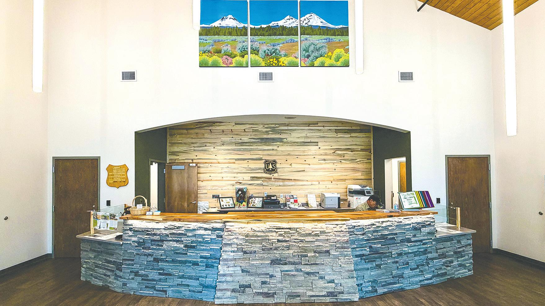 needs of our community into consideration, with two meeting rooms off the lobby available for community use after hours, as well as designing a large parking lot with RV parking spaces to help support large city events. The lobby features a large three-piece artwork done (and donated by) a Sisters High School student, which adds a spectacular Sisters welcome to visitors!”