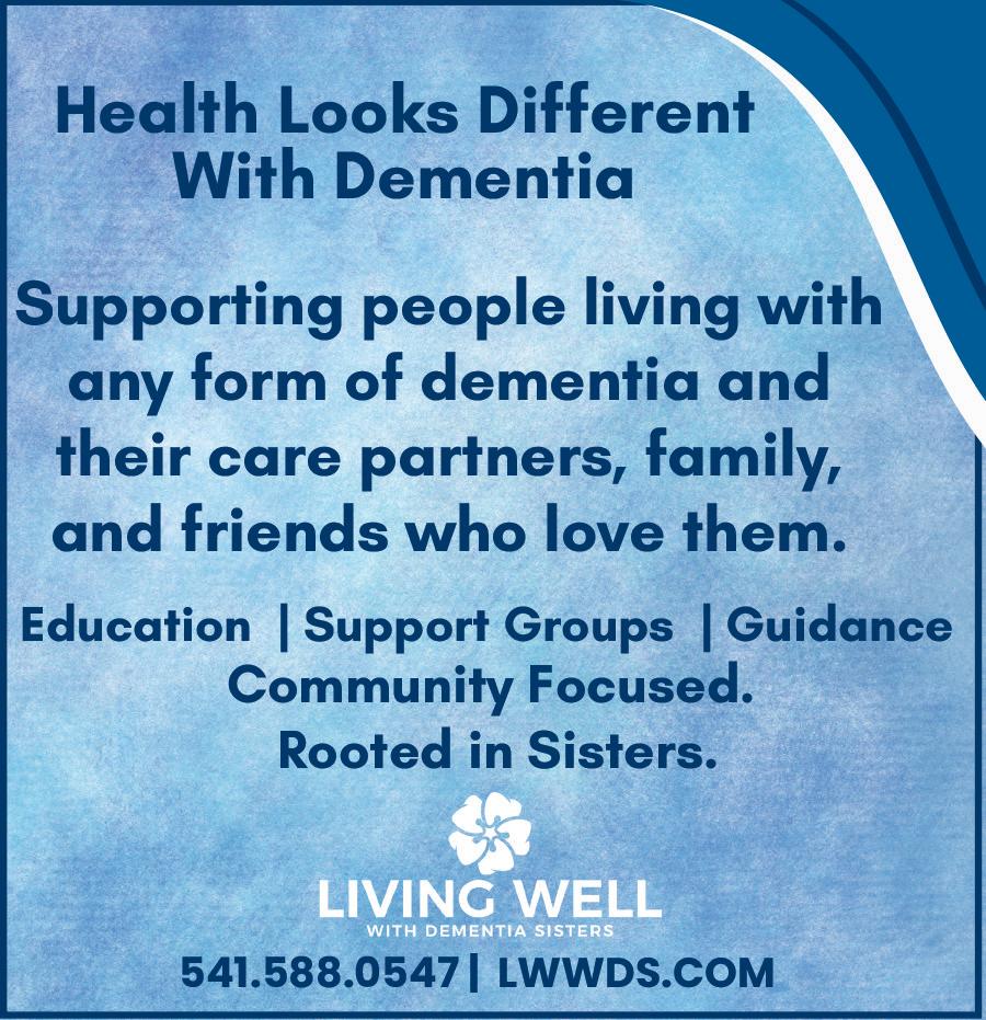 Living Well W ith Dementia Sisters Care Par tner Suppor t Group. 2nd & 4th Weds., 1-2:30 p.m. Siste rs Park & Recreation District Communi ty Center. 541- 588 -0547.