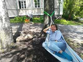 Puheenjohtaja Mila Nirhamo Nukketeatteritalon pihan riippukeinussa. Kuva: Elina Lajunen.