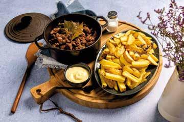 Formule in buffetvorm met aperitief, gebraiseerde visrolletjes in mosterdsaus of Vlaamse stoverij van varkenswangetjes of vol-au-vent met sla mix, geraspte worteltjes, tomaat, komkommer en goudgele frietjes.