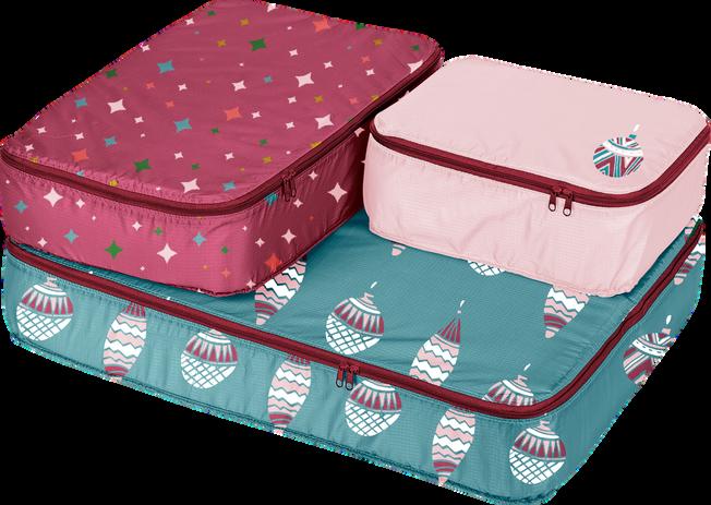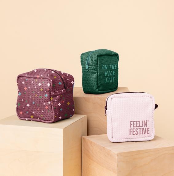 This holiday season, keep it festive when you travel with super lightweight and washable waffo pouches. It's the must have cosmetic pouches