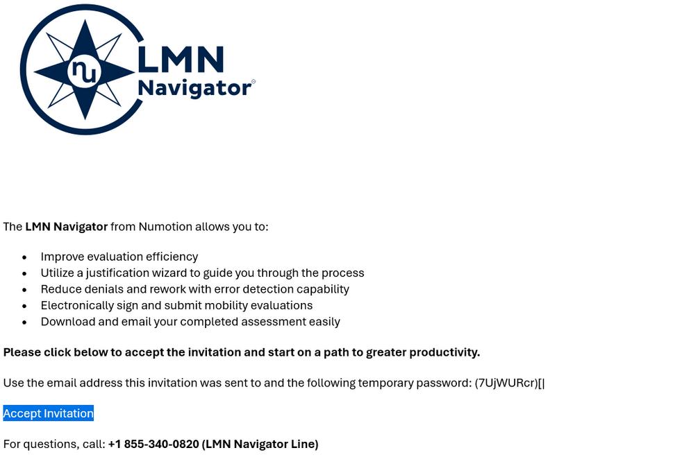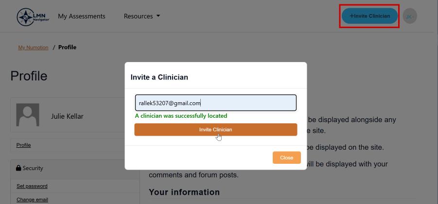 The ATP can log-in using their Numotion email address and password to invite the Clinician to sign-up for LMN Navigator.