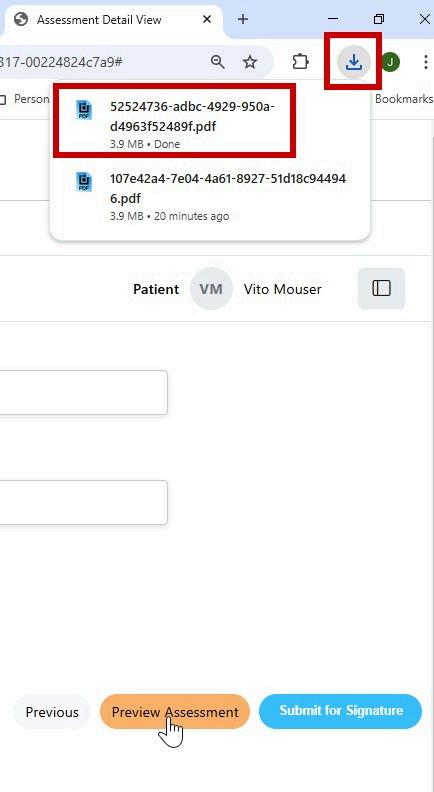 Clicking the ‘Preview Assessment’ button will open or download the completed pdf. This action will depend upon the users browser settings.