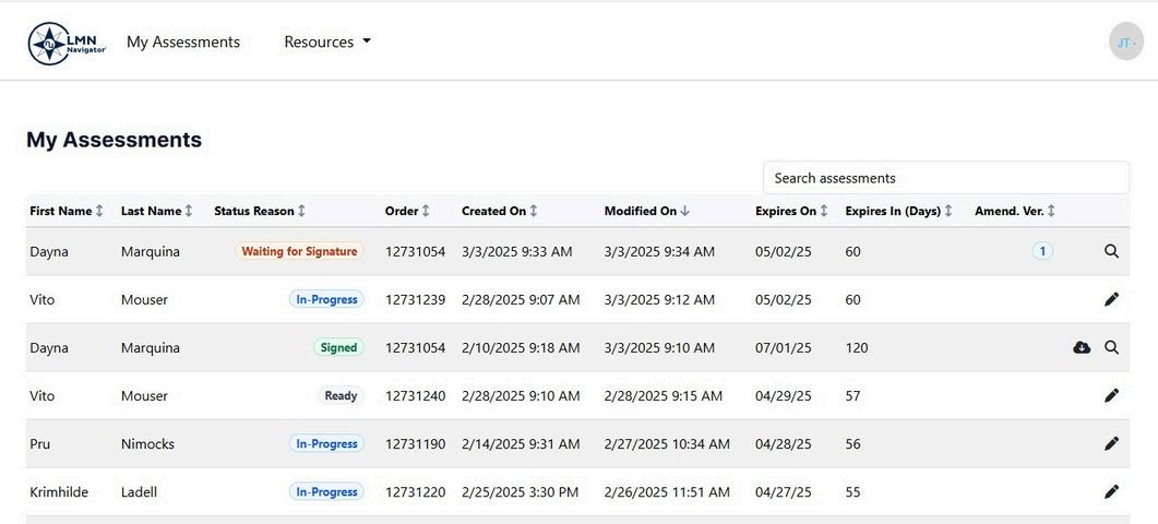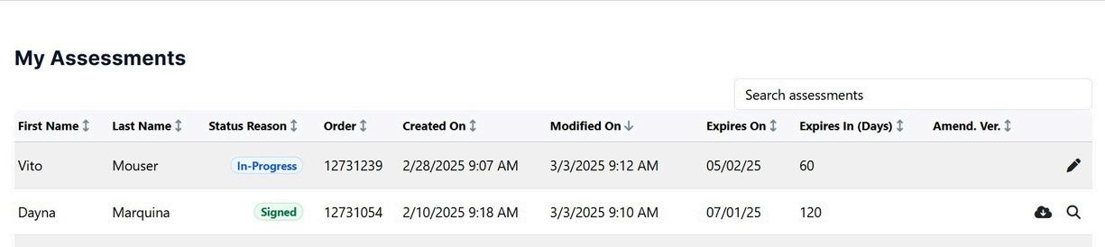 The ‘My Assessments’ page will contain assessments for any open Venu rehab order where the clinician is selected on the order. Click on the pencil icon to open the assessment.
