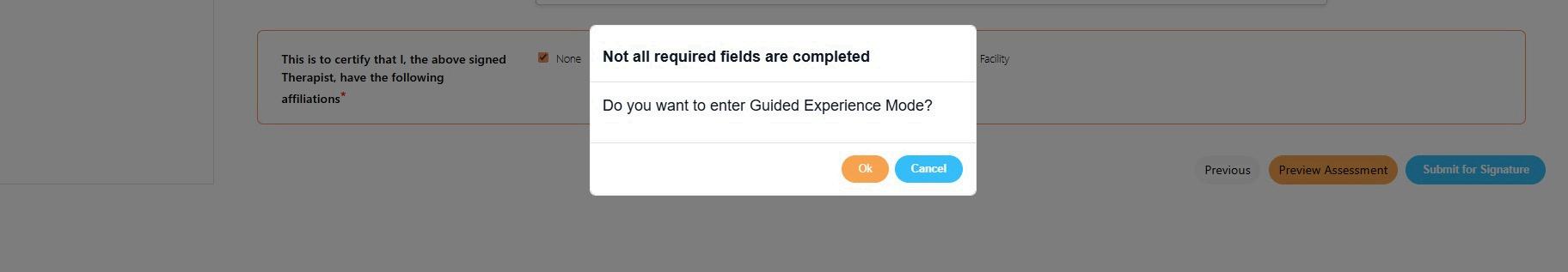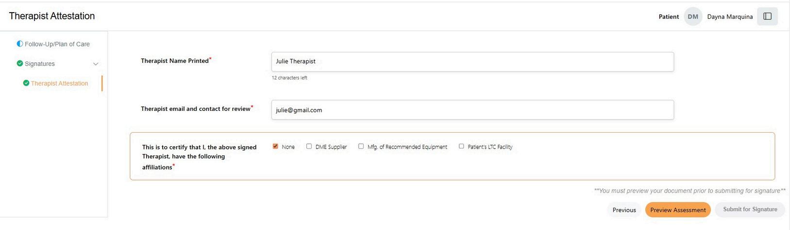 Prior to submitting the assessment for signatures, the clinician will review the completed document. The ‘Preview Assessments’ button will appear when all the fields on the ‘Therapist Attestation’ page are completed.