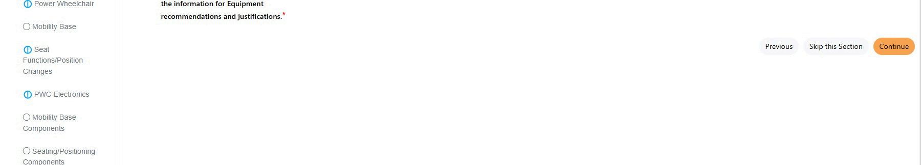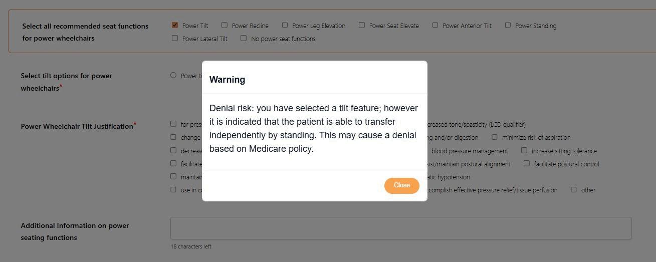 Denial Warning Message – if a of question answers has hist generated a claim denial, the notify the clinician – for exam question ‘Able to perform ind effective pressure relief/repe seated surface’ is answered ‘ ‘Pressure Relief Method(s)’ is ‘Stand up (independently, wit falling)’ then when ‘Power Ti the Equipment Recommenda message will warn of a Medic If required (marke skipped, when the Signature’ button display ‘Not all re completed. Do yo Experience Mode