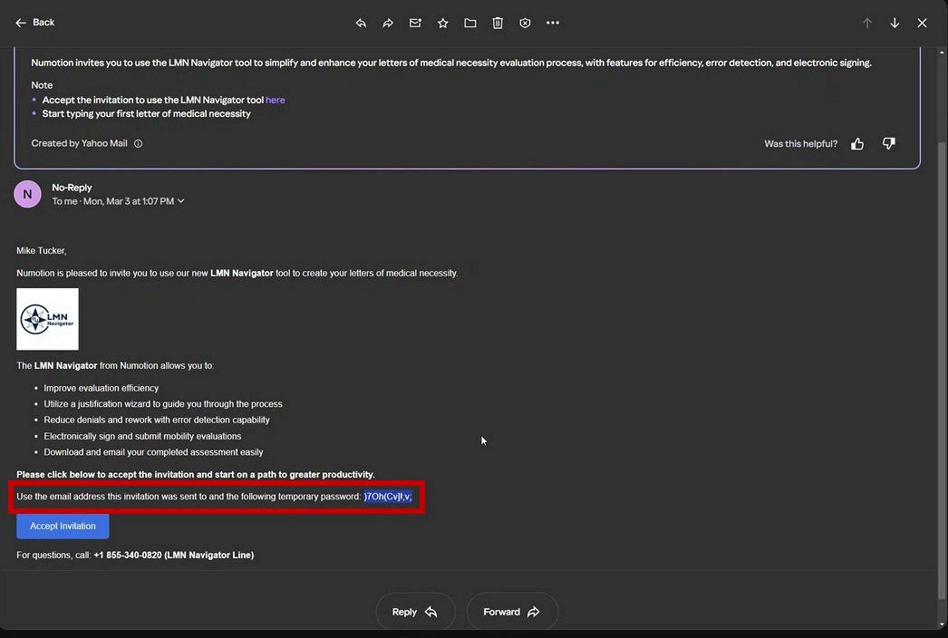 The Clinician will receive the email and with a temporary password included. They will click the Accept Invitation button and then copy and paste the temporary password. The system will prompt the user to create a new password