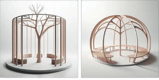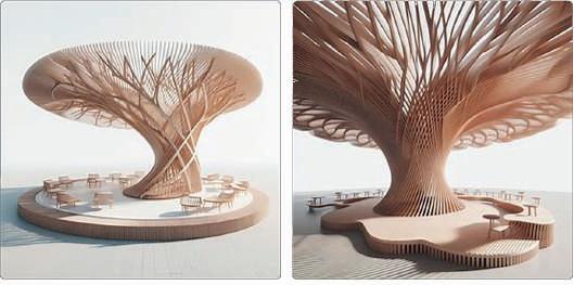 ‘A pavilion made of curved wooden members that mimics a single tree with a central straight trunk and branches from the trunk connecting the ground creating seating spaces in a solid white background.’ 7