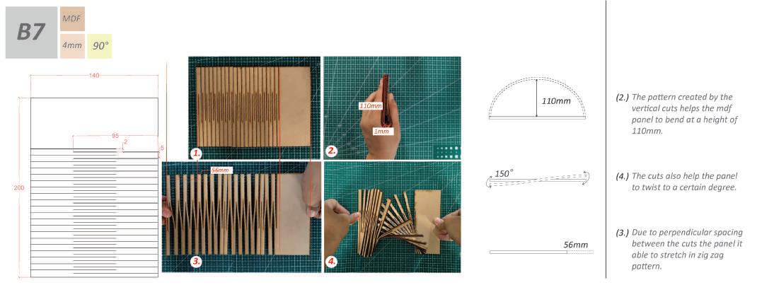 This iteration takes in learnings from the previous experiements that explored kerf patterns and distance between 2 kerfs - to a circular patterned, where a continuous cut helps create a different pattern, based on how they are arranged.