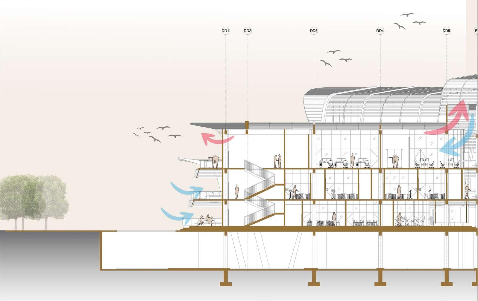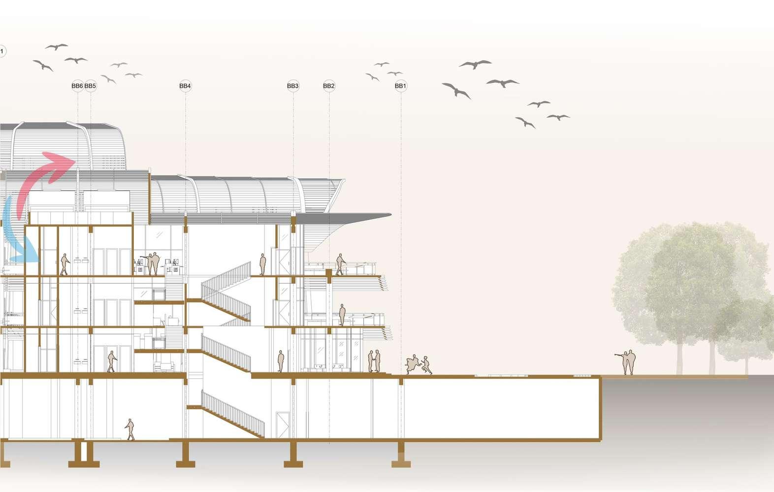 Large canopy acts as a shading devices, which shelters the lightfilled atrium spaces.