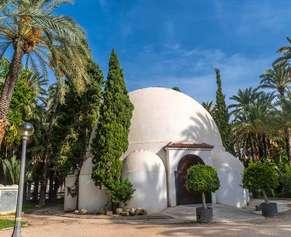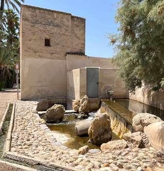 Uso agrícola: producción de dátiles y cultivos de regadío bajo palmeras con un sistema hidráulico de origen en la época romana y consolidación musulmana basada en la Acequia Mayor (canal principal de riego) que toma el agua del río Vinalopó y mediante la Acequia Árabe (red secundaria) la distribuye hacia los huertos, a través de infraestructura de partidores, canales y turnos de riego (dula). El agua también servía para generar actividad económica gracias al Molino del Real dedicado a la molienda de cereal. Este uso se mantiene tras la conquista cristiana.