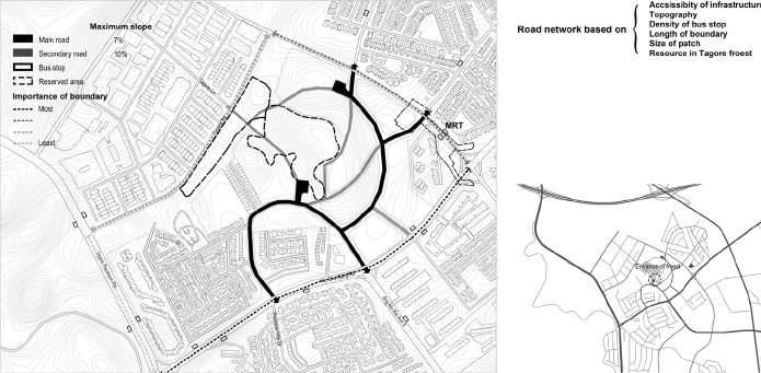 A 30hectre small patch of fallowing land in Ang Mo Kio district has grown into a mature secondary forest since the former kampong and its accompanying landscape was phased out in the 1970s. Currently, the Tagore forest has become an important stopover for wildlife moving to/from the central catchment Nature Reserve. According to Nature Society Singapore (NSS)’s report (2016), this fairly undisturbed area is distinctively rich in biodiversity - It is home to more than 32 noteworthy plants, several critically endangered animals including the Sunda pangolin, Sunda slow loris, banded leaf monkey and 71 forest birds species that could be further threatened if connective elements such as corridors and stopovers are lost or diminished. The forest is also regularly utilized by some member of the community. Along several informal footpaths and two scenic freshwater streams running through the both sides of the forest, recreationists can be seen trekking, strolling, and cycling towards Lower Seretar Reservoir. Sporadic informal ‘home gardens’, residents whom enjoy living near the greenery and bird watchers can also be spotted along the forest bordering estates, offering a vestige of the old kampong life that once thrived in the area. The forest patch is bounded by a 6-lane wide major road along the east side of the nature reserve (West), 4-lane wide neighbourhood road (East and South) and major highways SLE (North), making cross-boundary connectivity a challenge. It is also surrounded by a business district and two residential towns (Teachers’ Housing Estate, & Lentor Estate) which consist of private landed houses, low-rise condominiums, institutions & industrial areas, several new development plots, and reserved sites for future development. These neighboring built environments are neither distinctive nor varied; they are typically landscaped of private house estates with monotonous greenery, similar streetscapes and cookiecutter plans with catalogue recreational facilities inserted in every cluster. Such homogenous landscapes are conducive neither to the formation of a neighborhood identity nor to the establishment of a healthy ecological network, calling into question current design and planning approaches which ignore the specificities of site context.