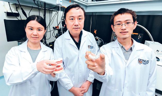 An NUS research team led by Prof Liu Xiaogang (centre) has created a revolutionary mouthguard that uses bite force to operate electronic devices such as computers, smartphones and even wheelchairs with high accuracy.